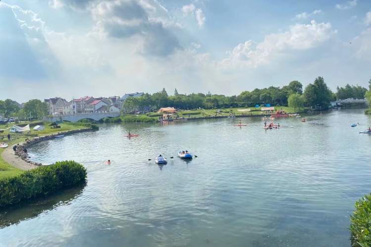 连民湖边的草坡确实是一个理想的露营场所。这里绿化不错,关键是临水,走几步路就可以把自带的皮划艇或者浆板拉下水,开启今年最火的水上运动。村里,也有租赁皮划艇和浆板游玩项目。中午,许多人自带食物或者自助烧烤,一家人或一群朋友享受着乡村带来的美好生活体验。