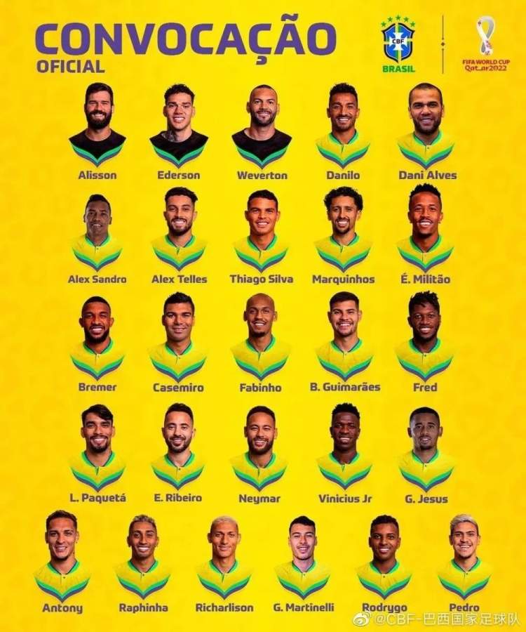 北京时间今天凌晨,5次世界杯冠军得主、FIFA排名第1的巴西队公布了卡塔尔世界杯26人大名单。巴西队由队内头号球星内马尔领衔,效力于皇马的维尼修斯、罗德里戈以及阿森纳队双星热苏斯、马丁内利在列,39岁的阿尔维斯入选,不过利物浦前锋菲尔米诺遗憾落选,库蒂尼奥因伤缺阵。