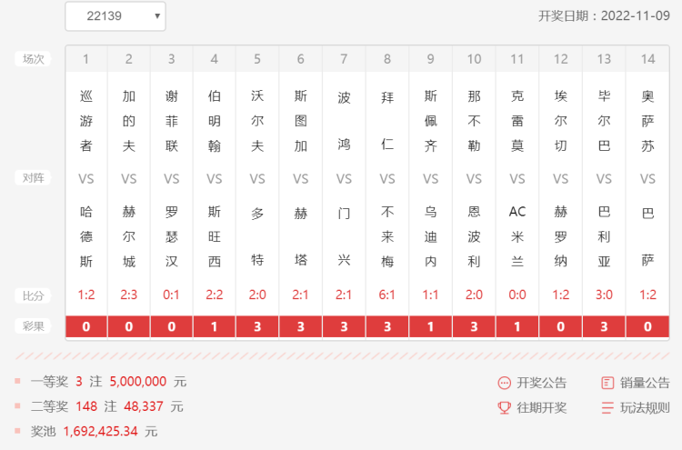 11月9日,胜负彩第22139期开奖结果出炉,一等奖开出3注,单注奖金500万元。