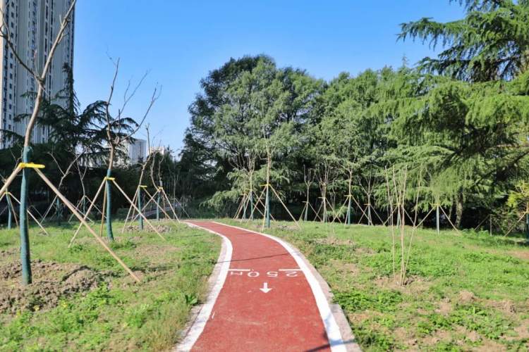 位于嘉绣路的嘉绣绿带面积137亩,主要树种香樟、雪松、桂花、女贞,现由第三方养护管理。2022年10月底完成林地抚育,新建步道1.01公里,由普通林地转变为开放式林地。