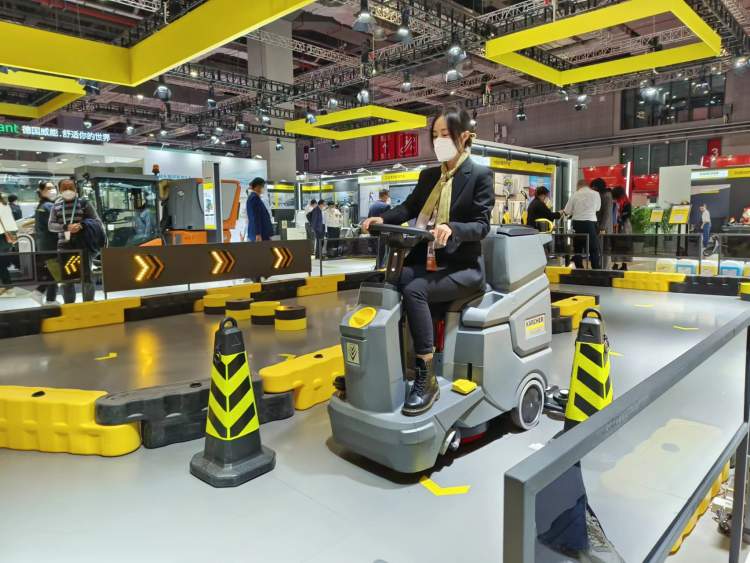据现场工作人员介绍,供观众体验驾驶的卡赫洗地机BD50/70,主要应用于地下停车场、大面积的商超、商场等公共区域。每小时可以清洗约2500平方米,充一次电可以用三四个小时,也就是充一次电可以清洗近万平方米。