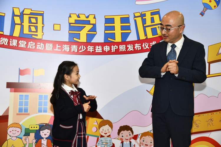 上海市残联副理事长莫彬彬、上海市残联教育就业处处长陈栋渊、上海市教委教材处副处长洪宇华、上海市残疾人基金会理事长柳瑾、上海新华传媒连锁有限公司党委书记、执行董事钮也仿等人出席手语微课堂揭牌仪式,为谢璐、魏建国、袁文婧、周佳艺这些入校阳光手语老师颁发聘书;同时重磅发布上海青少年公益助残的《益申护照》。