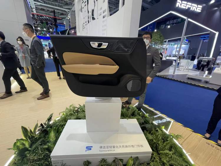不要以为车门板都是塑料的,本届进博会期间,在佛吉亚展台上,一台轻量化天然麻纤维门饰板非常有趣,使用了麻纤维与pp塑料1:1的比例制造,原料改变了,但是价格几乎与原来的门板一致。