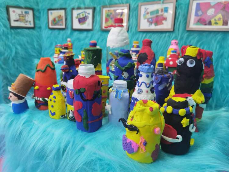 而在学校南面的教学楼层,更成了各个年级的小艺术家们施展才华的场地。一年级学生将语文作品与流体雕塑相结合,二年级的玻璃化装置则承载着艺术与灵魂之间的点“睛”之笔;三年级学生脑洞大开,普通的文具在他们的奇思妙想中,变身为一件件创想平面作品;四年级同学通过聆听、感受、描述等多种方式,将音乐与美术融合渗透,用画笔描绘出一幅幅音画;五年级的学生们更是展现出了他们在校五年的艺术学习成果。废旧的材料被化腐朽为神奇,搭建出一栋栋童话快乐小屋……