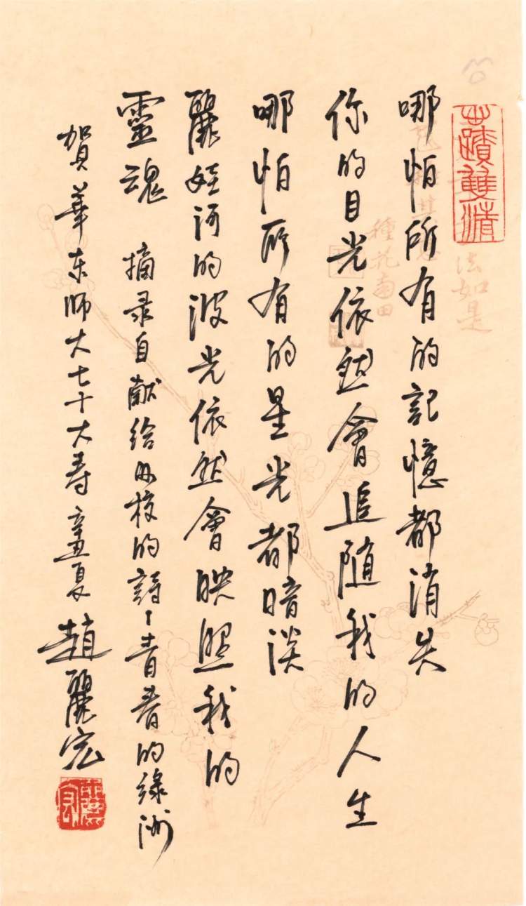 这次展出的手稿中,还有著名作家、散文家、诗人赵丽宏在华东师大七十周年校庆时书写的一首诗《青春的绿洲》:“哪怕所有的星光都黯淡,丽娃河的波光依然会映照我的灵魂。”