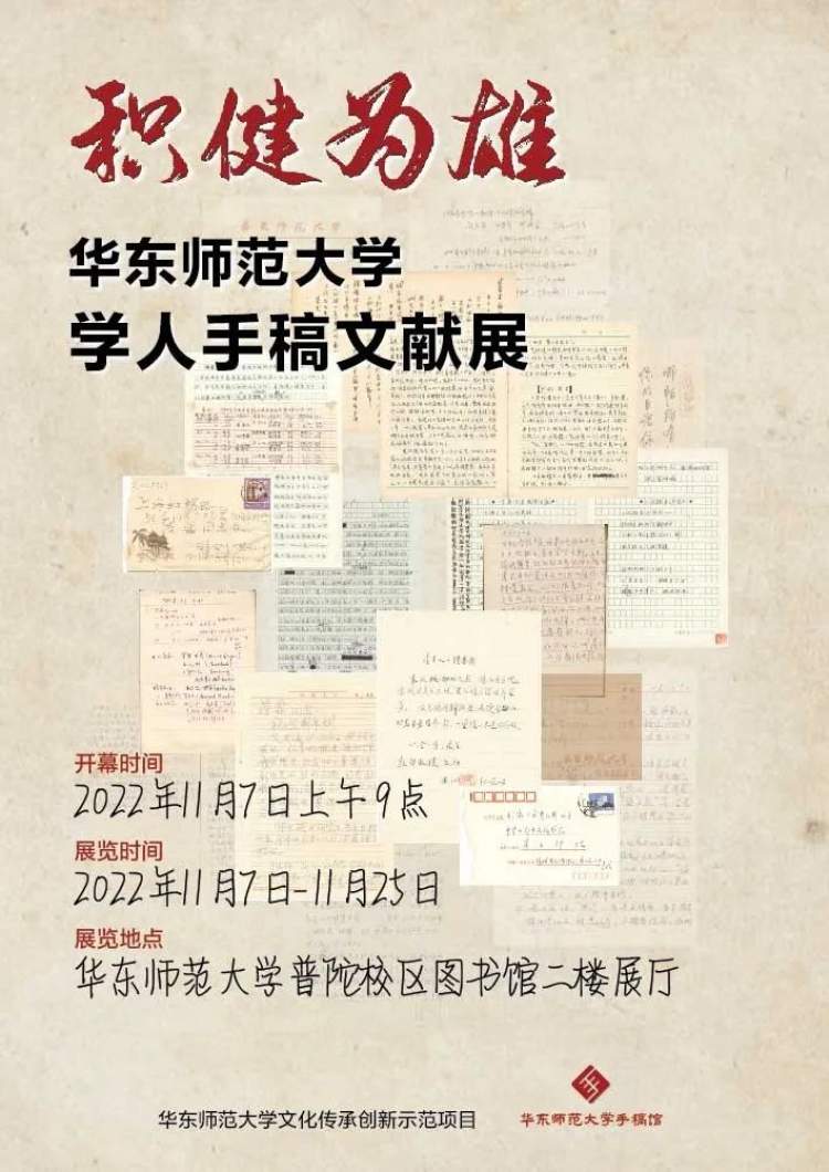 由华东师大图书馆主办的华东师大手稿馆启动仪式暨“积健为雄——华东师范大学学人手稿文献展”本周开幕。