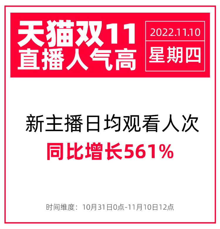 截至11月10日12点,淘宝直播新主播达人的日均观看人次同比增长561%。此前数据显示,过去一年,淘宝新增了超过50万名新主播。天猫双11临近的前两个月,有超过100家直播机构入驻淘宝。