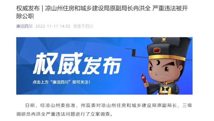 “廉洁四川”微信公众号11月11日通报,日前,经凉山州委批准,州监委对凉山州住房和城乡建设局原副局长、三级调研员冉洪全严重违法问题进行了立案调查。