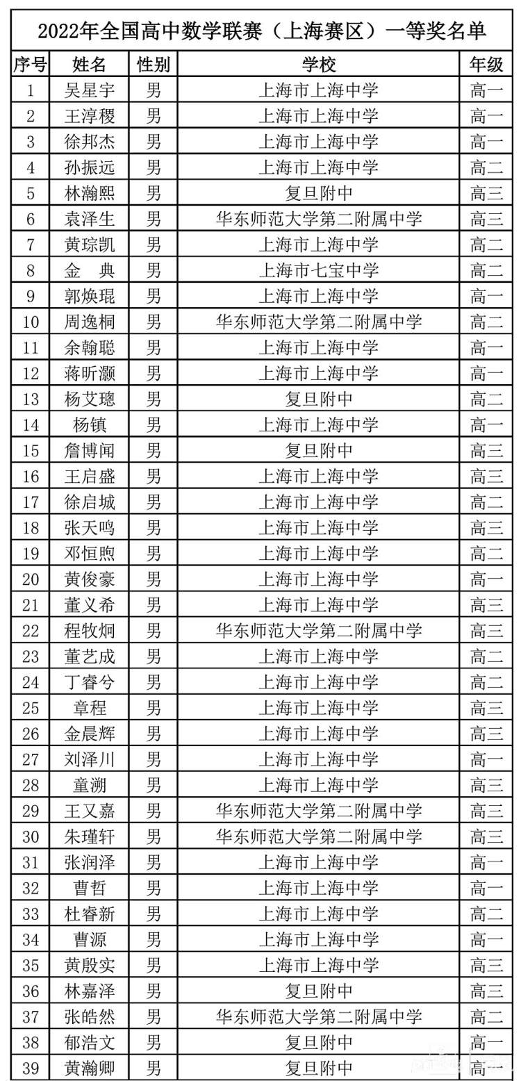 附:2022年全国高中数学联赛上海赛区一等奖名单