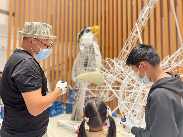 现场的孩子们在上海戏剧学院教授徐国峰的带领下,把不同形状和废弃垃圾安置在白色框架上,共同制作完成作品。通过自然、城市化与环境污染的视觉冲突,提升公众生态环境保护意识。