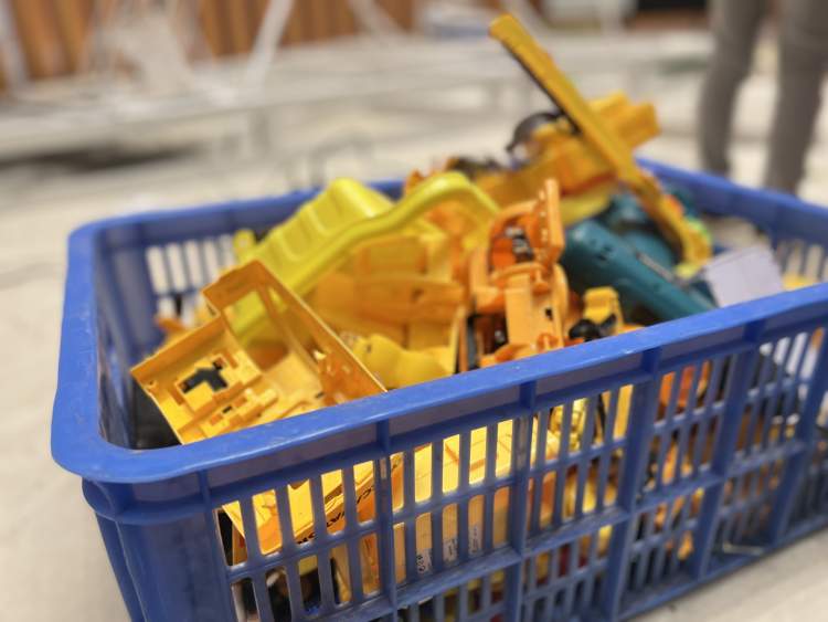 白色的钢管和铁丝搭建出震旦鸦雀的视觉主体,周围的整理箱里装着五颜六色的废弃塑料垃圾,黄色的玩具车、白色的摩托车保险盖、黑色的小轮胎……