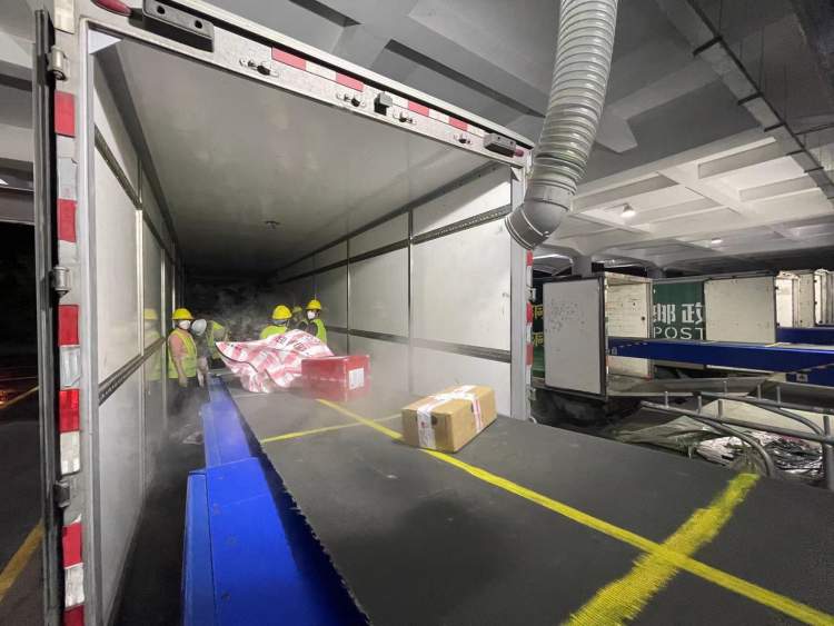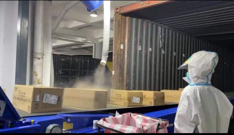 在处理中心工作区域,目前投入了六台喷雾消毒机,对应12条卸车道,对卸车邮件全数消毒,同时配备手动喷雾应急使用,做到邮件消毒全覆盖。