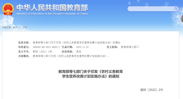 记者从教育部网站获悉,教育部等七部门日前印发《农村义务教育学生营养改善计划实施办法》,进一步加强和改进营养改善计划工作,持续提升农村学生营养状况和身体素质。办法明确,学校食堂由学校自主经营、统一管理,不得对外承包或委托经营。