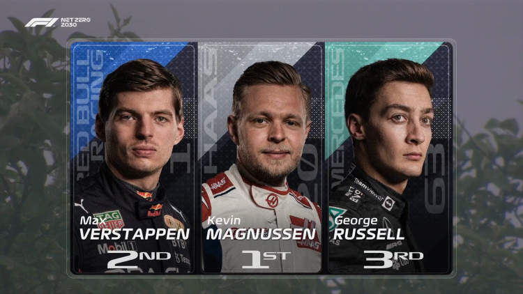 提前卫冕成功个人年度车手总冠军的红牛车手维斯塔潘排在第二名,第三名是为马格努森送上幸运、引发事故红旗的拉塞尔。