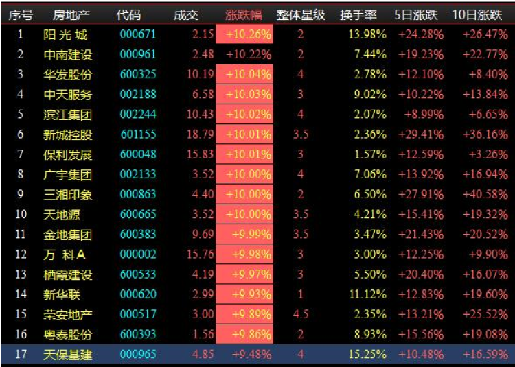以周三为例,当天大A全天下挫,但116只房地产股票,有93只上涨,占80.17%,其中涨停的有5只。而已经出现买点、持续上涨的则有47只,占40.52%;周四,上涨70只,占总数60.34%,持续上涨的有31只,占总数26.72%;周五,109只房地产股票上涨,占比93.97%,其中有16只涨停,占比大大超过10%。