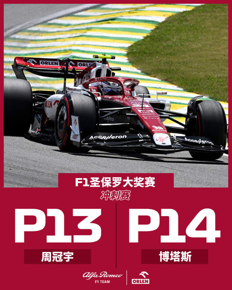 F1大奖赛巴西站的冲刺赛在北京时间今天清晨结束,前一天排位赛成绩不理想的阿尔法罗密欧车队中国车手周冠宇以第13名完赛,为自己明天的正赛争取到了一个相对靠前的位置。