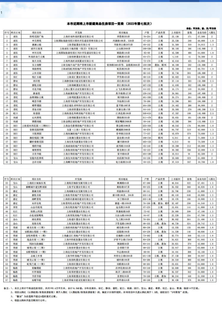今天,上海市房管局宣布,2022年,本市第七次以集中批量供应的方式推出房源。该批房源共涉及57个项目,总建筑面积约190.6万平方米,共计16060套,备案均价72730元/平方米,分布在浦东、徐汇、静安、普陀、虹口、杨浦、闵行、宝山、嘉定、奉贤、松江、金山、青浦、临港14个区域。