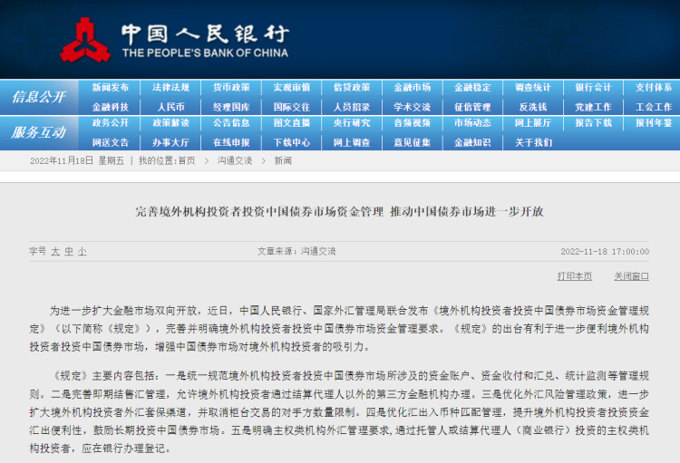 为进一步扩大金融市场双向开放,近日,中国人民银行、国家外汇管理局联合发布《境外机构投资者投资中国债券市场资金管理规定》(以下简称《规定》),完善并明确境外机构投资者投资中国债券市场资金管理要求。《规定》的出台有利于进一步便利境外机构投资者投资中国债券市场,增强中国债券市场对境外机构投资者的吸引力。