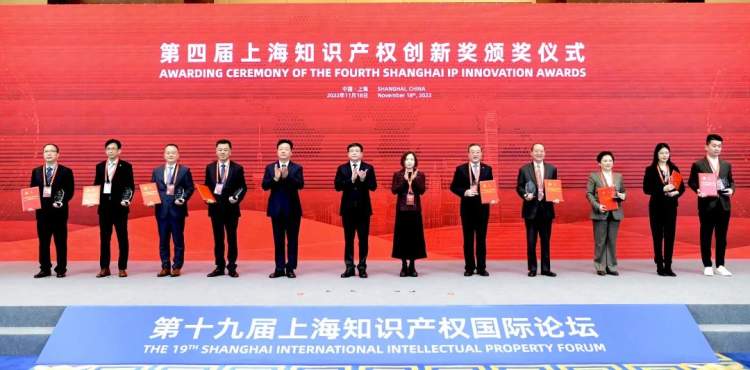 上海市副市长陈群、国家知识产权局副局长胡文辉和世界知识产权组织总干事特别授权代表、中国办事处主任刘华为获得第四届上海知识产权创新奖的单位和个人代表颁奖。