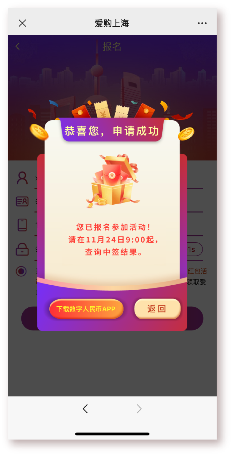 市民需依次填写姓名、身份证号码、手机号、勾选“我已阅读并同意《上海市“爱购上海”数字人民币满减红包活动规则》选项,获取手机验证码并点击提交。