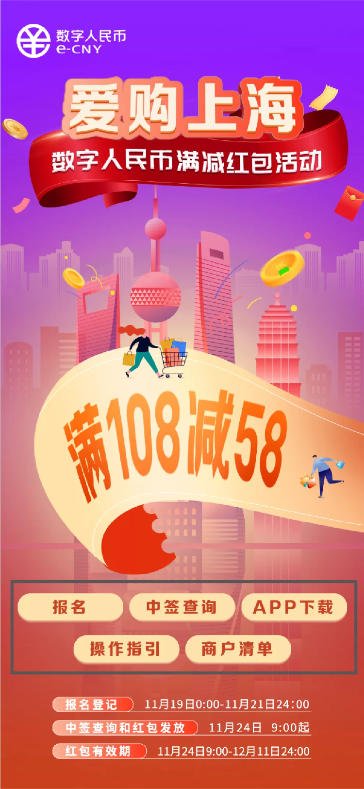70万个满108元减58元数字人民币满减红包来了!记者从市商务委获悉,数字人民币满减红包发放活动将于11月19日0时启动报名。同时,申城将安排新增发放一轮“爱购上海”电子消费券,发放安排于11月下旬另行公告。