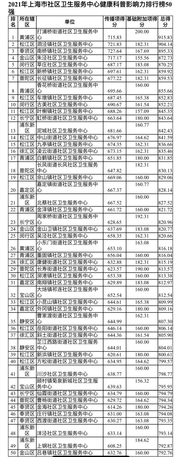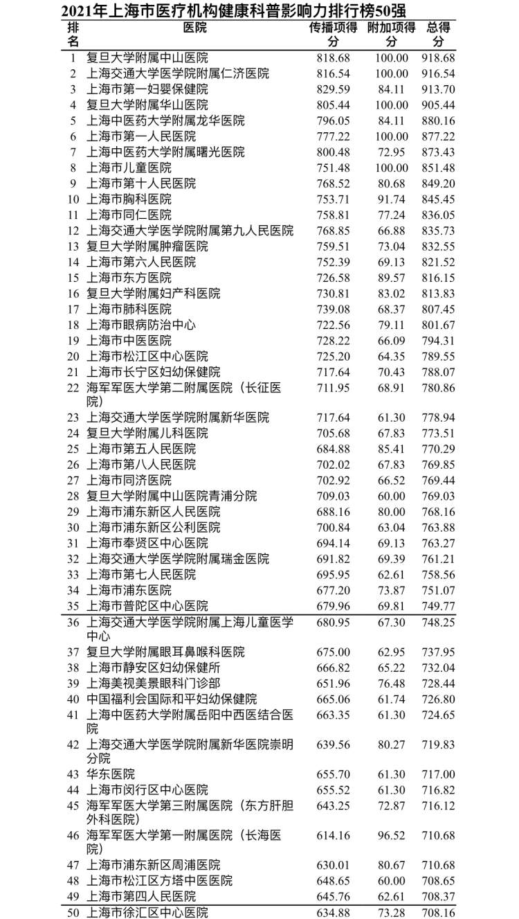 为激励全市各级医疗机构、医务人员更好发挥健康科普“主阵地”“主力军”作用,扩大优质健康科普资源供给,市健康促进委员会办公室、市卫生健康委组织上海市健康促进中心、复旦大学公共卫生学院在全国推出首个医疗机构和医务人员健康科普影响力指数排行榜。评价结果显示,复旦大学附属中山医院、上海交通大学医学院附属仁济医院、上海市第一妇婴保健院等入选医疗机构健康科普影响力指数排行榜50强;黄浦区打浦桥街道社区卫生服务中心、松江区泗泾镇社区卫生服务中心、奉贤区南桥镇社区卫生服务中心等入选社区卫生服务中心健康科普影响力指数排行榜50强;段涛等入选医务人员健康科普影响力指数排行榜100强。