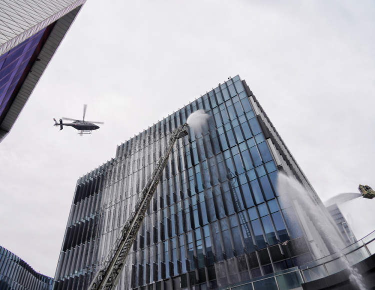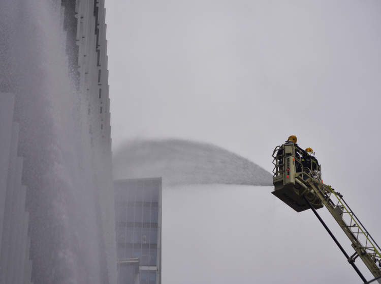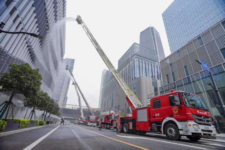 当被困人员被救出后,随着火场指挥长一声令下,所有参战力量发起总攻。云梯消防车、高喷消防车等先后喷出水柱,合力扑灭了明火,演习取得了圆满成功。