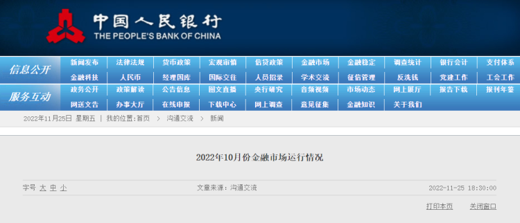 25日,中国人民银行官网发布了2022年10月份金融市场运行情况。