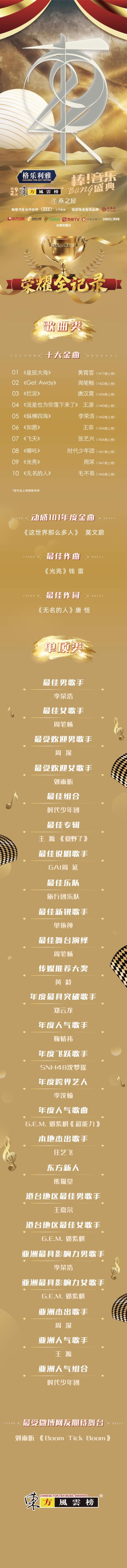 周深与刘雨昕分别获得“最受欢迎男歌手”和“最受欢迎女歌手”;邓紫棋获港台地区最佳女歌手、亚洲最具影响力女歌手,歌曲《超能力》获得年度人气歌曲;王源获得“亚洲人气歌手”;时代少年团荣获“最佳组合奖”和“亚洲人气组合”的荣誉。