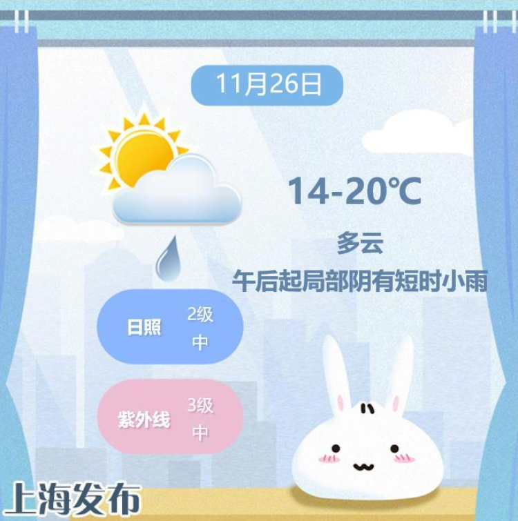 今天申城多云,偏北风转偏东风3-4级,早晨前后局部地区有雾,目前大雾黄色预警信号维持,大家出行注意交通安全。今天午后局部地区阴有短时小雨,气温与昨日相仿,全天在14-20度之间。