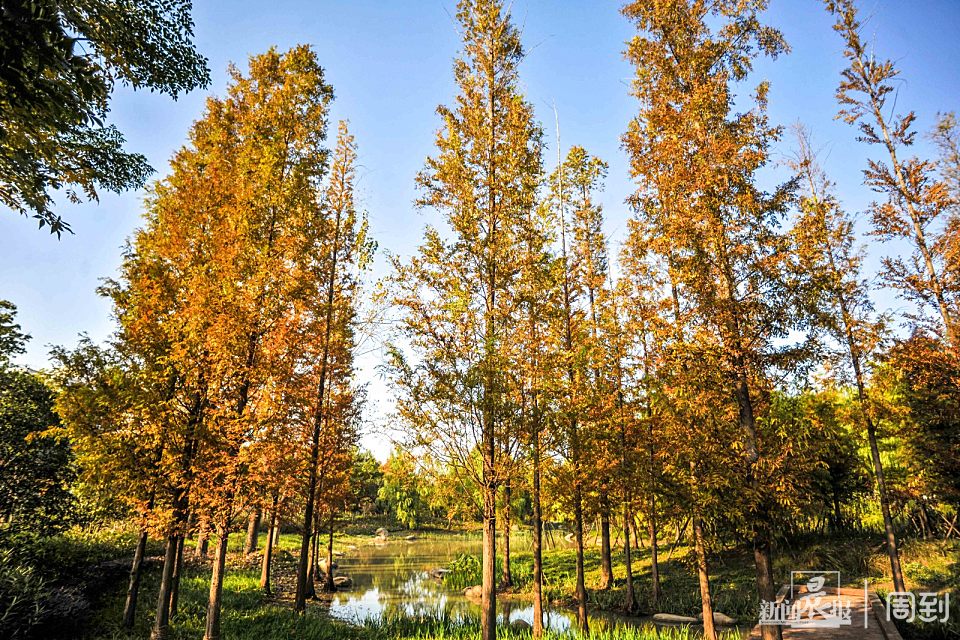 看完乌桕后再去不远的水杉镜林打个卡,高高的水杉倒映在湖面,形成了“水杉镜林”的独特景观。蜿蜒木栈道贯穿着整个水系,游客可以漫步木栈道,徜徉于秋林间,一览满眼秋色。