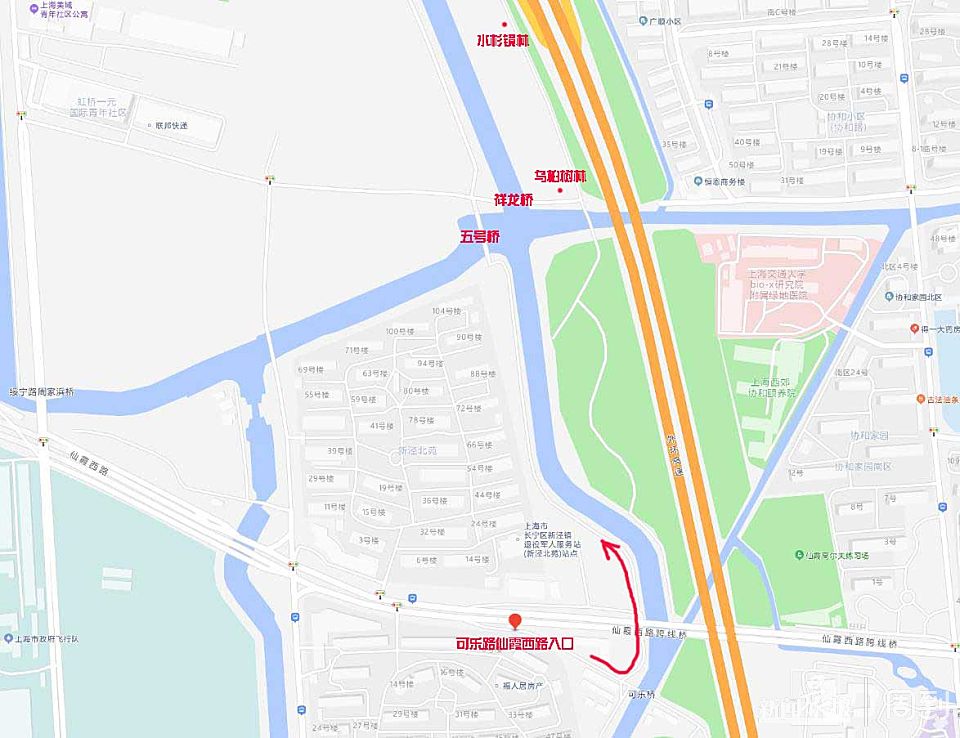 仙霞西路跨线桥西南侧有一条不起眼的便道,这就是外环林带生态绿道可乐路仙霞西路入口。生态绿道最适合骑行,自己的自行车可以骑进绿道,而共享单车不可进入。