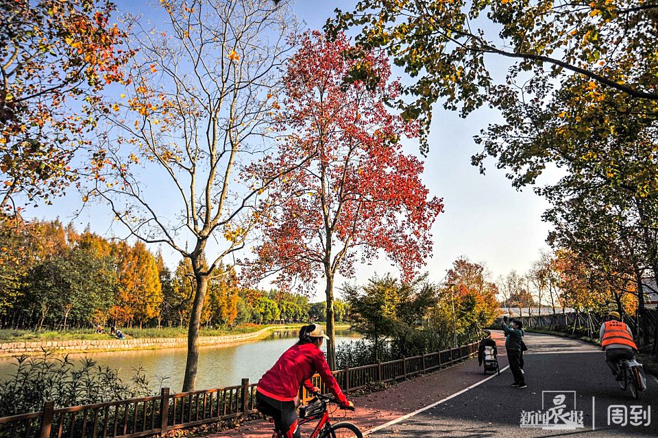 刷场所码进入之后,就可看到红色的步道和灰色的骑行道,这里有左右两条道,我们去看乌桕树就向北沿外环西河步道骑行,步道两侧的乌桕树呈现出绿、黄、红的斑斓色彩。