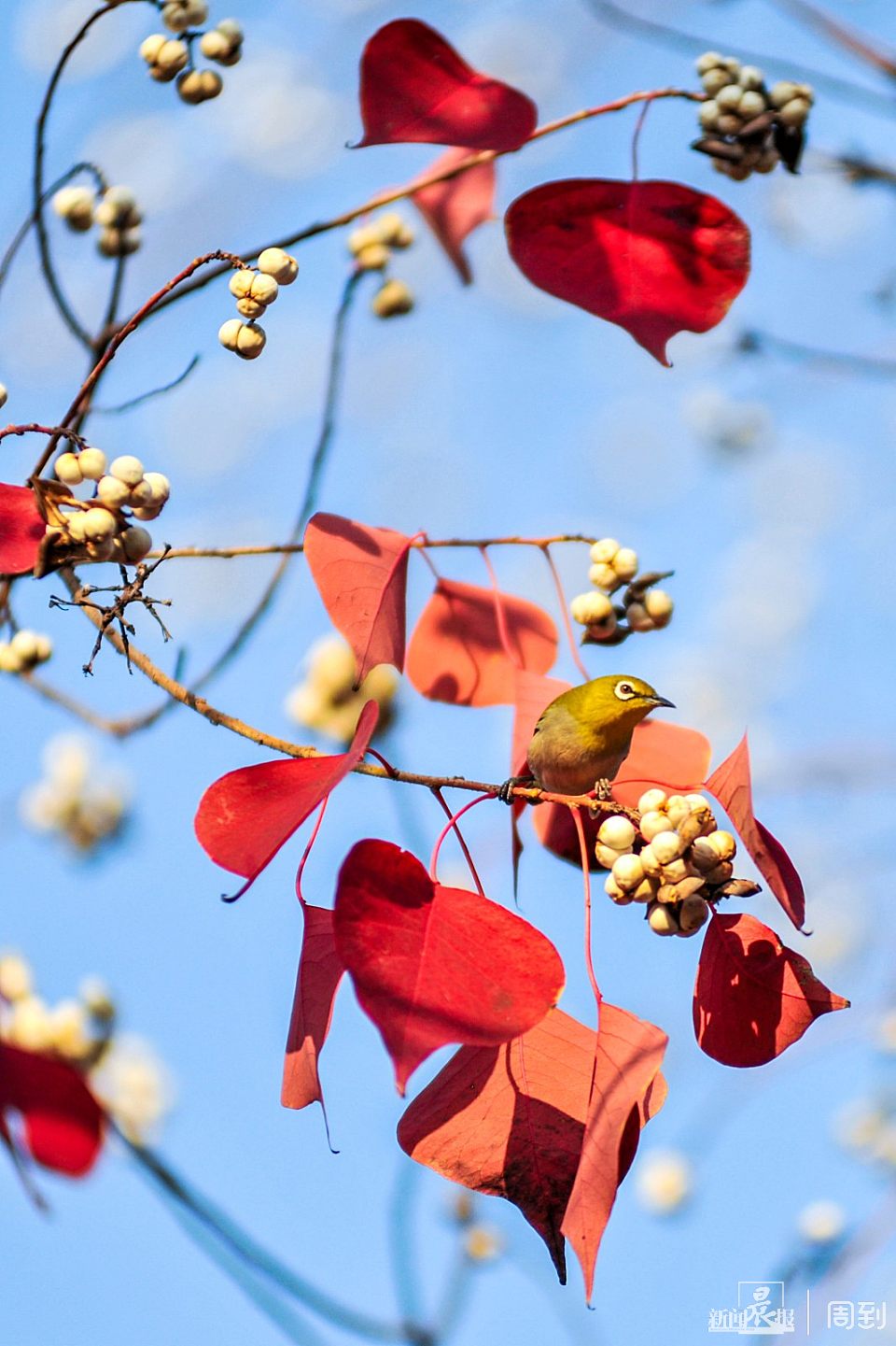 小小的绣眼鸟飞上枝头,美美地啄食乌桕籽。