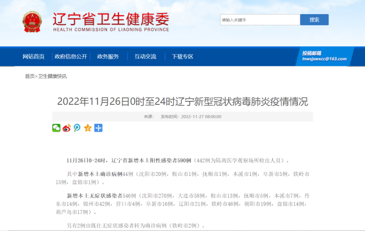 据辽宁省卫健委官网消息,11月26日0-24时,辽宁省新增本土阳性感染者590例(442例为隔离医学观察场所检出人员)。