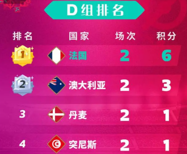 目前,D组积分榜上,法国队积6分;澳大利亚队1:0战胜突尼斯后,积3分;丹麦与突尼斯各积1分。