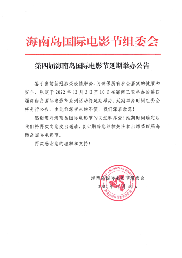 鉴于当前疫情形势,第四届海南岛国际电影节延期举办 周到君 2022-11-30 来源:周到上海 海南岛国际电影节官微今日下午发布延期举办公告:鉴于当前疫情形势,为确保所有参会嘉宾的健康和安全,原定于2022年12月3日至10日在海南三亚举办的第四季海南岛国际电影节系列活动将延期举办。延期举办时间组委会将另行公告。 来源:周到上海 作者:周到君 赞一个 (0)