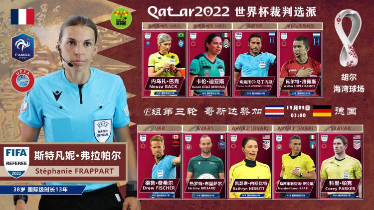 在所有6名参加卡塔尔世界杯执法的女性裁判员中,法国人弗拉帕尔是3名有资格出任主裁判的女性裁判员之一,而且她又是执法男子国际比赛经验最丰富的一个。