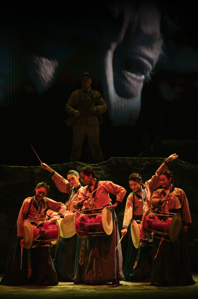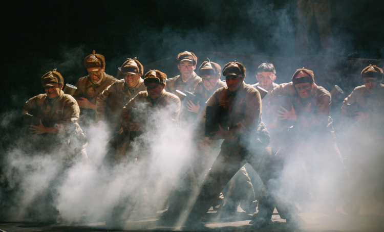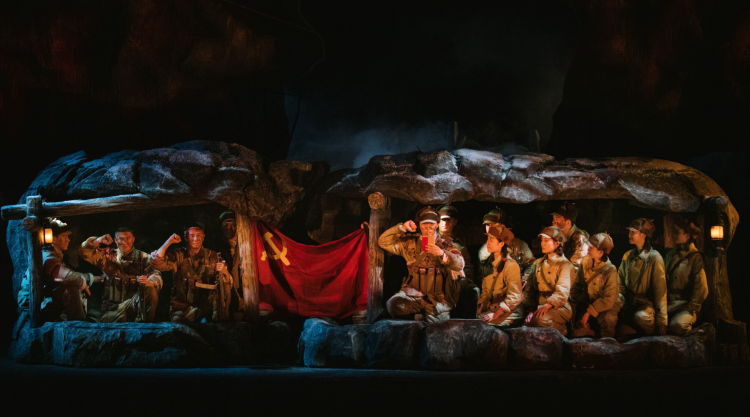 两片6米高相纸高悬于舞台两侧,烧焦的边缘、残破的形状,展现出经“战火烘烤”及“硝烟熏染”过的人、景、物。原本随风飘摇的相纸放大数十倍的体积后稳固、坚定,串联起前线后方的亲情故事。数十名演员妆容黝黑,衣角深染炮灰,穿梭于舞台。战火焦灼下,一幅经硝烟熏染过后的油画卷徐徐展开在观众眼前。