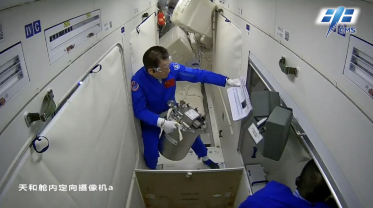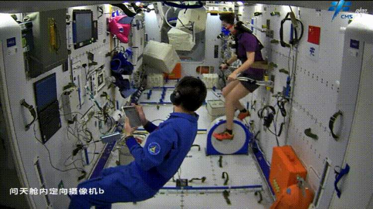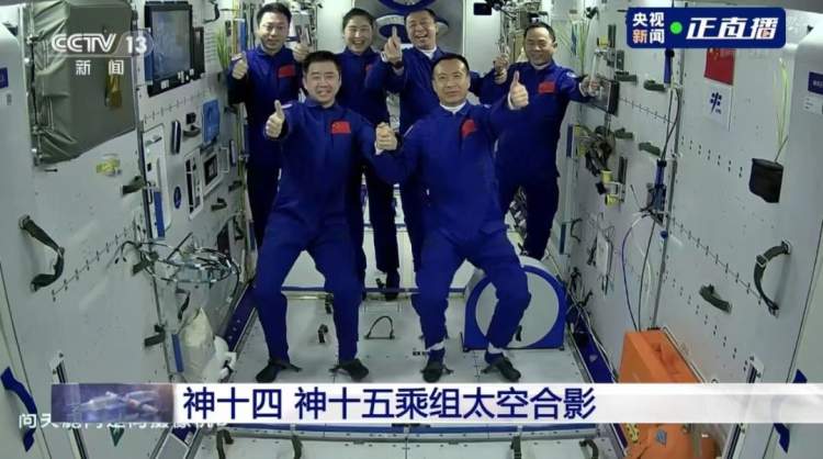 △神舟十四号乘组指令长陈冬在舱门口迎接神舟十五号乘组指令长费俊龙