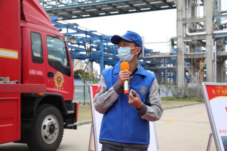 在活动现场,他以消防安全知识为题,讲解了消防"四懂"、"四会"以及应急逃生等知识,分享了化工企业常见的火灾事故、违章违规案例,并与现场观众进行了互动。