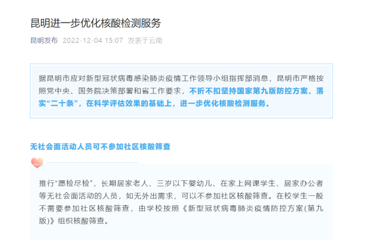 “昆明发布”微信公众号4日消息,据昆明市应对新型冠状病毒感染肺炎疫情工作领导小组指挥部消息,昆明市严格按照党中央、国务院决策部署和省工作要求,不折不扣坚持国家第九版防控方案、落实“二十条”,在科学评估效果的基础上,进一步优化核酸检测服务。
