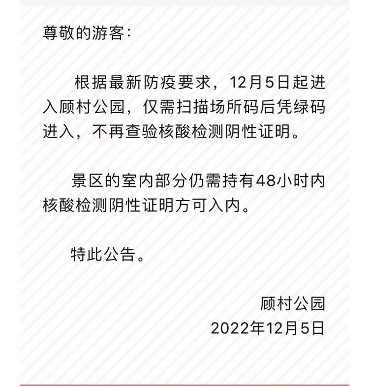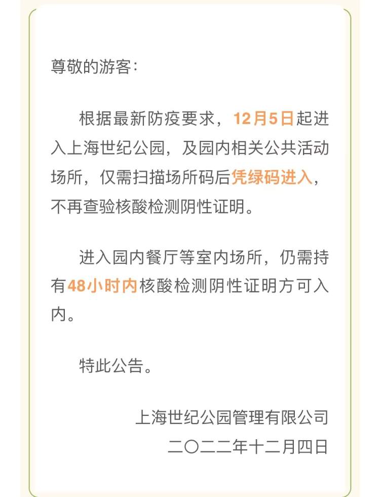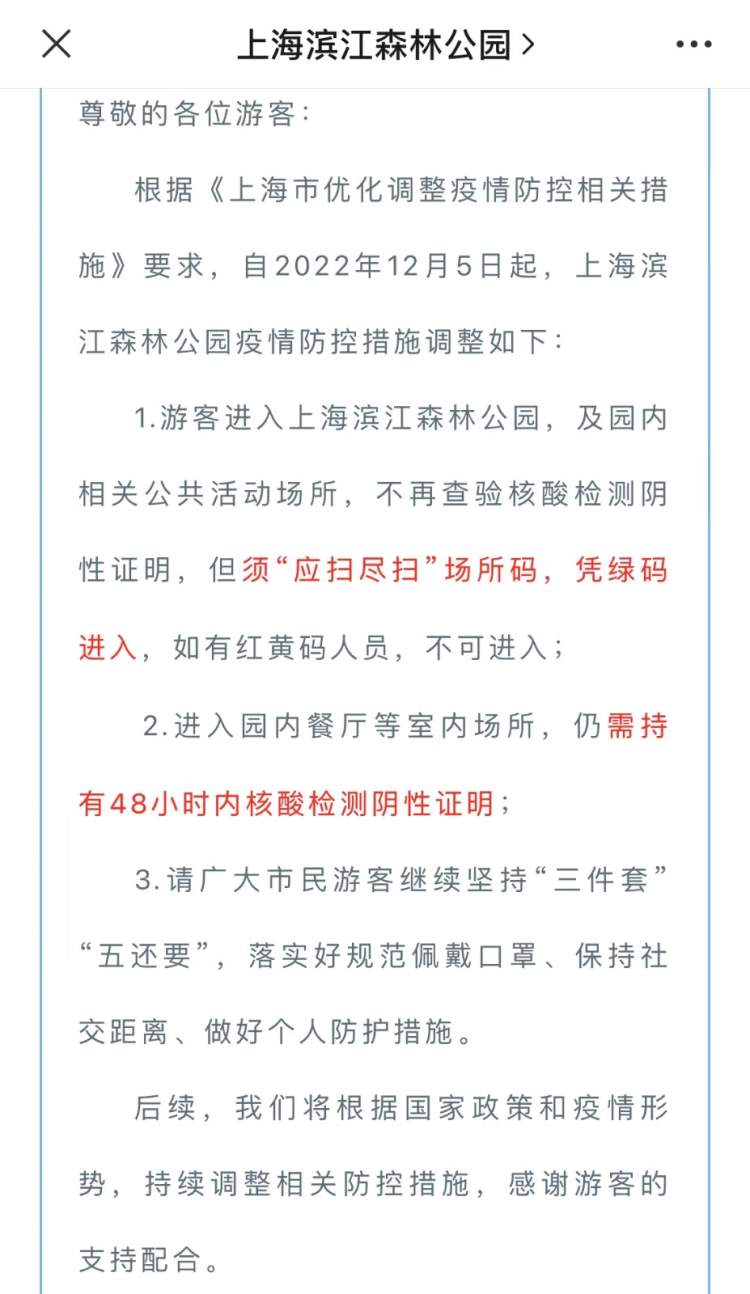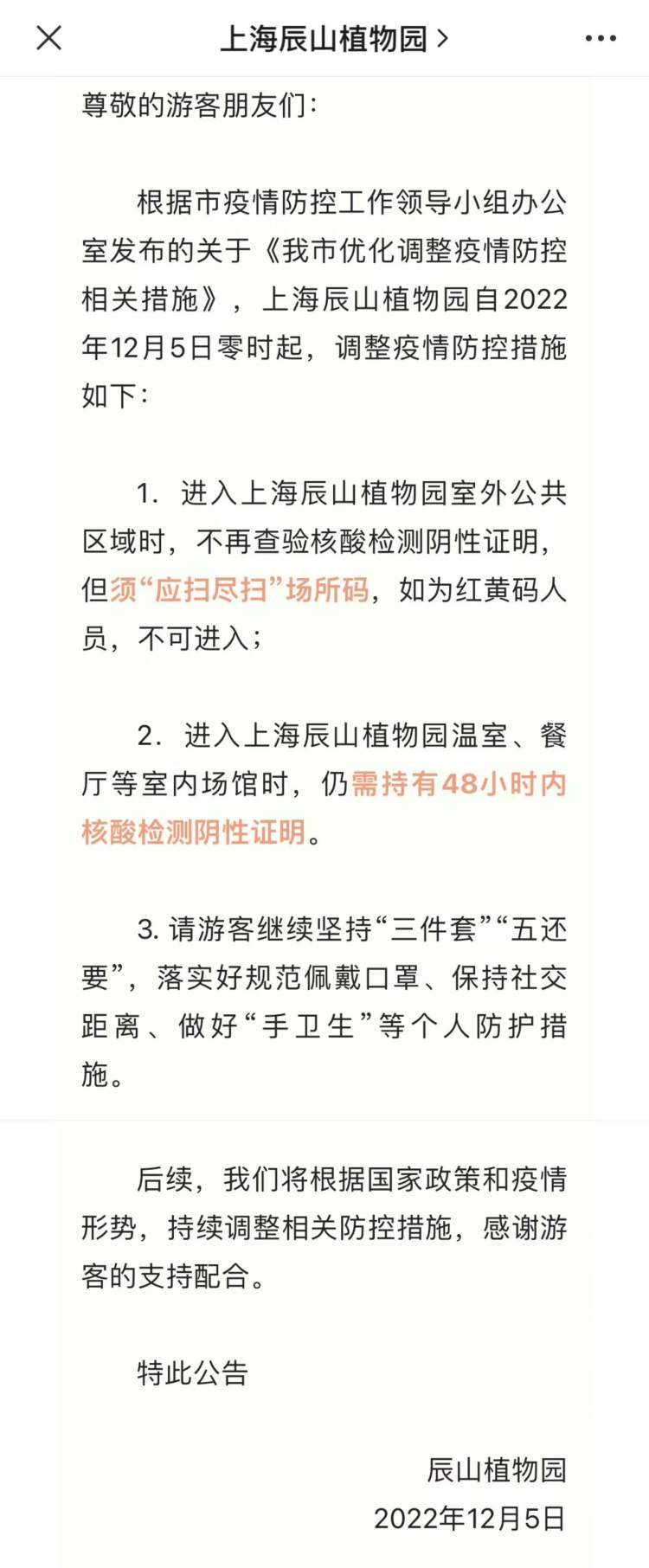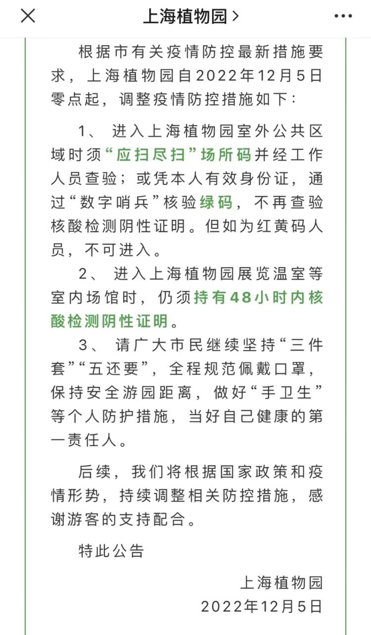 本市各公园调整疫情防控措施,室外区域不再查验核酸阴性证明,室内场所仍需48小时核酸 郁文艳 2022-12-05 来源:周到上海 12月4日下午及12月5日上午,上海植物园、辰山植物园、世纪公园、滨江森林公园、顾村公园、世博文化公园等本市各大公园纷纷发布疫情防控措施调整,自12月5日零时起,进入公园室外公共区域时不再查验核酸阴性证明,但仍需扫场所码,红、黄码人员不可进入公园。进入温室、餐厅等室内场所仍需持有48小时内核酸检测阴性证明。 需要注意的是,由于厕所为室内场所,所以进入厕所也须”应扫尽扫“场所码。同时,游园时要保持社交距离,规范佩戴口罩,做好”手卫生“等个人防护措施。 来源:周到上海 作者:郁文艳 赞一个 (0)