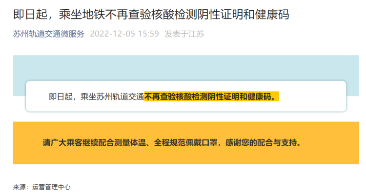 苏州:即日起 乘坐轨道交通不再查验核酸检测阴性证明和健康码 周到君 2022-12-05 来源:周到上海 “苏州轨道交通微服务”微信公号5日下午消息: 即日起,乘坐苏州轨道交通不再查验核酸检测阴性证明和健康码。 请广大乘客继续配合测量体温、全程规范佩戴口罩,感谢您的配合与支持。 来源:周到上海 作者:周到君 赞一个 (0)