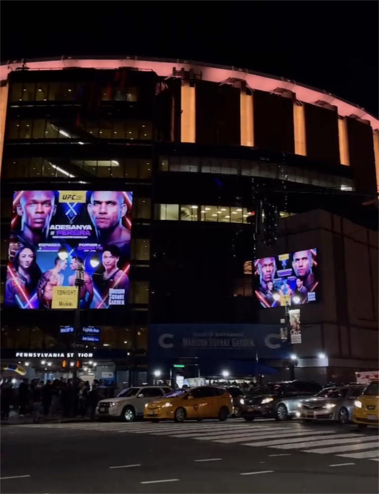 11月中旬,纽约夜间的温度已落到5度以下,行人在夜色里竖起大衣衣领匆匆赶路。但当他们经过麦迪逊广场花园时却很难不被张伟丽和卡拉的巨幅广告牌吸引去目光,而此时更多的人正鱼贯涌入赛场。
