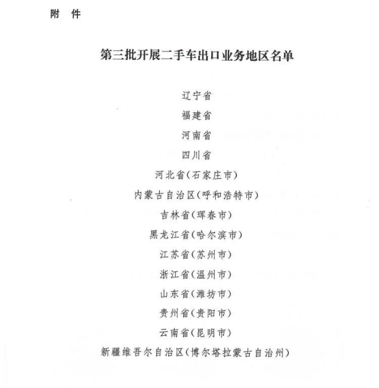 通知指出,为贯彻落实国务院关于二手车出口工作的决策部署,积极有序扩大二手车出口,推动外贸保稳提质,经研究,决定新增辽宁省、福建省、河南省、四川省、河北省(石家庄市)、内蒙古自治区(呼和浩特市)、吉林省(珲春市)、黑龙江省(哈尔滨市)、江苏省(苏州市)、浙江省(温州市)、山东省(潍坊市)、贵州省(贵阳市)、云南省(昆明市)、新疆维吾尔自治区(博尔塔拉蒙古自治州)等14个地区开展二手车出口业务。