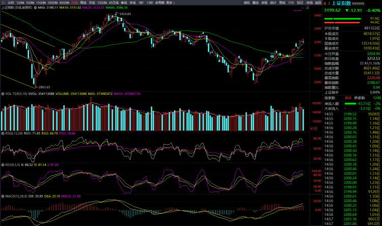 今天沪深两市双双低开,盘中中药、新冠治疗板块探底回升,上海凯宝涨超10%,新华制药涨停,振东制药、亨迪药业、广生堂、贵州三力等多股反弹;信创板块走强,英飞拓再度涨停录得5连板,汉王科技、信雅达触及涨停,四方精创、网达软件、天阳科技、润和软件等跟涨。午后,景点及旅游、酒店及餐饮版板块异动,中青旅、众信旅游、九华旅游、西域旅游、岭南控股、君亭酒店、锦江酒店等纷纷冲高;数据确权板块拉升,人民网冲击涨停,中文在线、新华网、视觉中国、华媒控股等跟涨。最后沪市下跌0.40%,报收3199点;创业板上涨0.87%,报收2414点。两市全天成交额9487亿元。