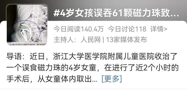 近日,浙江大学医学院附属儿童医院又收治了一个误食磁力珠的4岁女童。