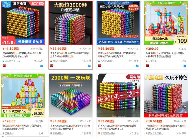 磁力珠又叫巴克球,是一种带有磁性的玩具。它的通常玩法是利用磁力把珠子拼成各种各样的形状,不少商家打出“益智玩具”的名号进行售卖。