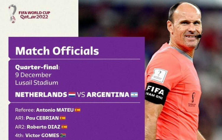 此外,国际足联和卡塔尔世界杯组委会宣布了阿根廷队和荷兰队这场四分之一决赛的裁判安排。西班牙名哨拉奥斯将带领他的团队执法本场比赛,小组赛中备受关注的美国队和伊朗队的比赛也是由他主哨的。